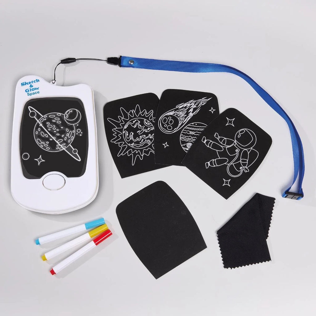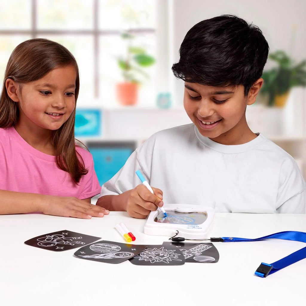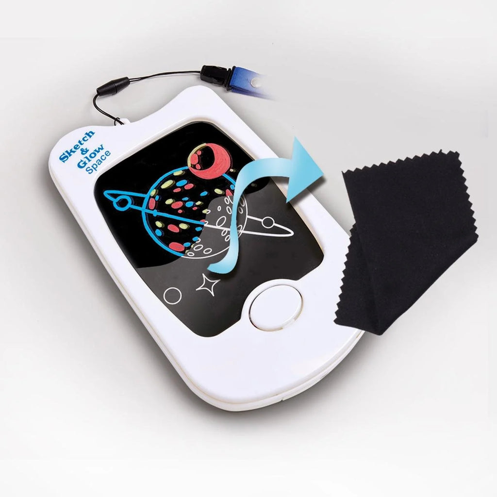 Hours of fun with this unique fairytale sketch and glow set! Simply insert a trace card of your choice and start creating with the coloured pens provided. The handy lanyard makes this perfect for on-the-go creations. A multi-coloured light effect will bring your designs to life! Simply use the cloth to wipe the pad clean and start again!