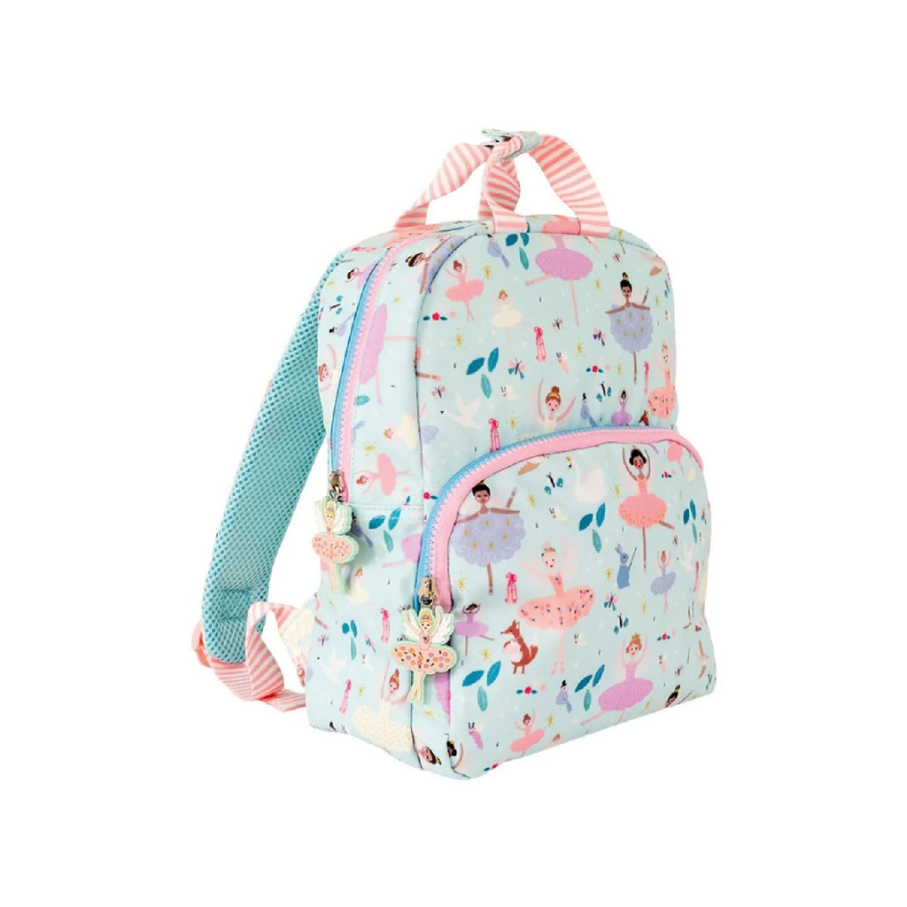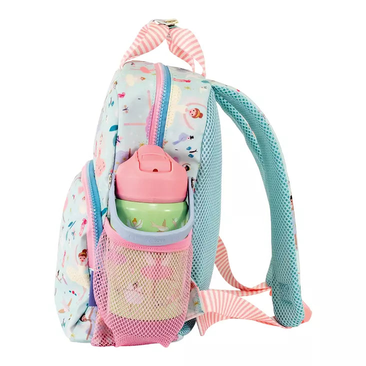 Perfect for young adventurers and explorers, the Floss & Rock backpack featuring our gorgeous Enchanted design is the best addition to your next trip. Whether you’re on your way to school, jet-setting on a plane or grooving to your dance class, this backpack is the perfect size to safely hold all of your belongings. Featuring a handy front pocket with a zip, padded, adjustable shoulder straps, a chunky, fun ballerina-shaped zip pull, a side pocket for holding your drinks bottle and a handy carry loop (with super cool stripes) perfect for hanging up on a peg. Inside the bag is a lovely Enchanted print and an ‘I belong to…’ label for personalisation.