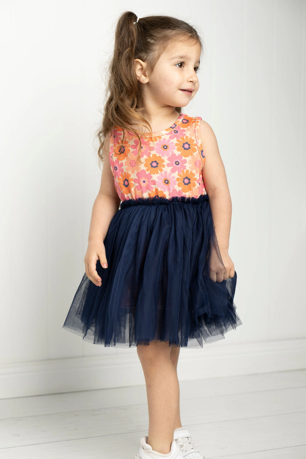 Get ready to spin, leap, and dance in this vibrant tutu! Bursting with bold pink, orange, and navy patterns, it's the perfect companion for imaginative play and magical moments. The soft navy straight tulle flows beautifully with every movement, while short sleeves keep things breezy and comfortable. Whether it's a backyard performance or dress-up adventure, this tutu brings joy and colour to playtime.