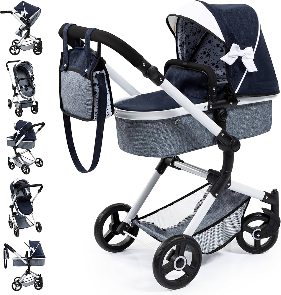 Bayer Classic Doll Pram Kids Stroller Dark Blue & Denim with White Bow