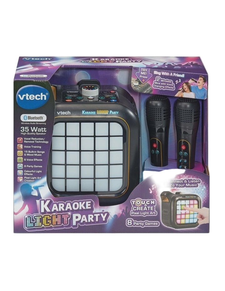 Bring the energy of a live concert to your home with the VTech – Karaoke Light Party. This portable Bluetooth® speaker comes with two wireless microphones, allowing you to sing solo or duet with friends. With built-in songs and voice effects, it's designed to make every performance feel like a star-studded event.