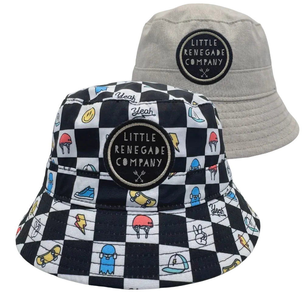 The Checkmate Reversible Bucket Hat features a bold black and off-white check print with retro 90’s-inspired icons, paired with a coordinating grey reverse side for easy outfit changes.