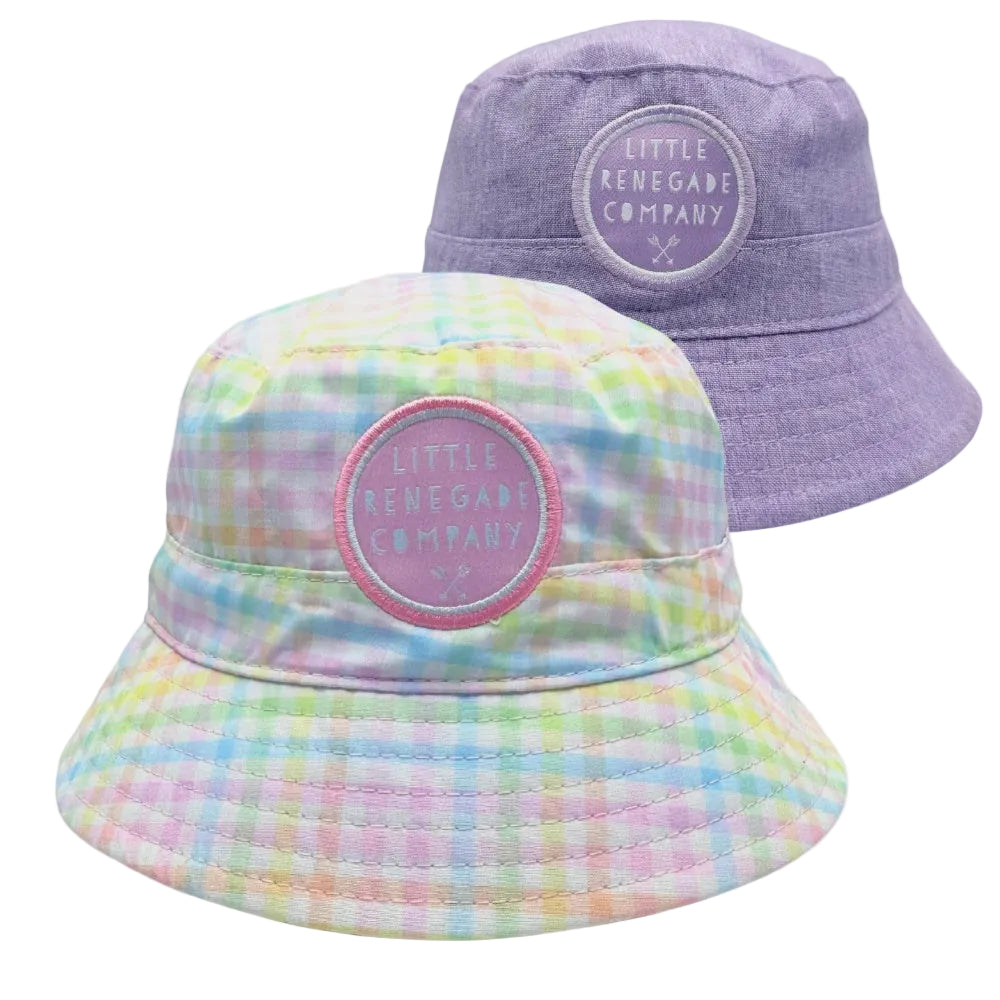The Sherbert Reversible Bucket Hat features a dreamy pastel gingham print in soft sherbert tones on one side, with a textured lilac reverse for effortless styling.