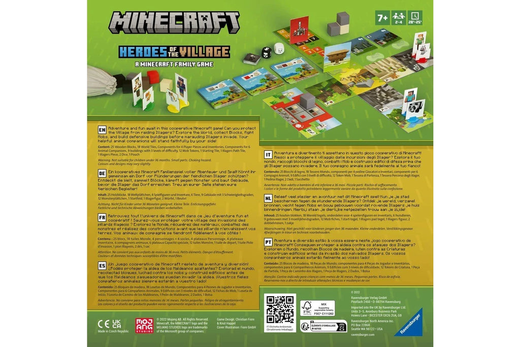 Based on the world-famous video game phenomenon “Minecraft”! 2–4 players work together to rebuild an abandoned village before the enemy Illager can attack them. To do this, they explore exciting biomes, collect important resources and fight against dangerous monsters. Only together, and with the support of their faithful animal companions, can they repel the Illager attack!