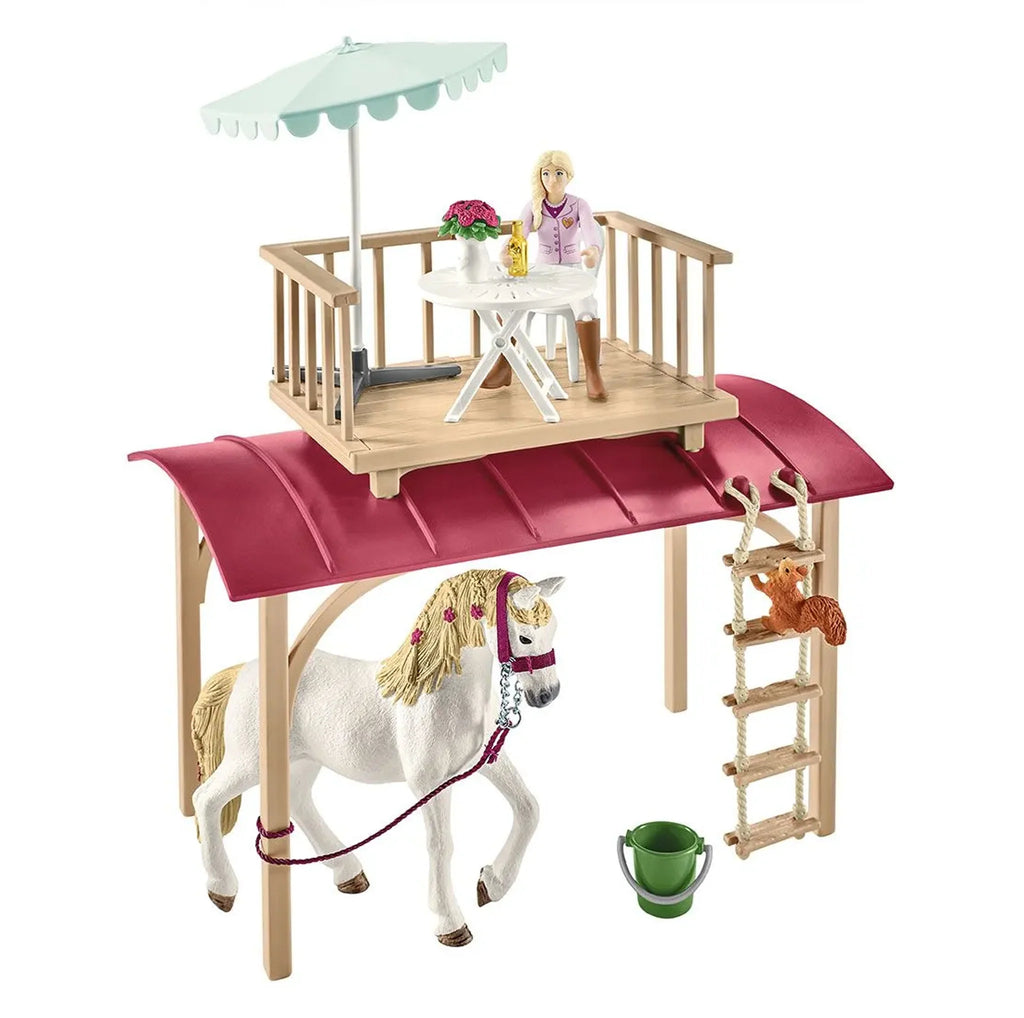 1x fully flexible figure, 1 x Andalusian Mare, 1x squirrel, 1x stall, 2x lanterns, 1x ladder, 1x chair, 1x sunshade, 1x outdoor table, 1x sofa, 1x living room table, 1x lamp, 1x window box, 1x rope ladder, 2x winner rosette, 1x saddle, 1x bridle, 1x rein, 1x halter, 1x hay rack, 1x comb, 1 x grooming brush, 1x straw bale , 1x bucket, 1 x apple, 2x cushion, 1x campfire, 1x bottle, 2x barbecue stick with sausage, 2x cup, 2x mug, 1x bowl, 1x plant pot, 3x wooden log, 1x sticker, 1x assembly instructions