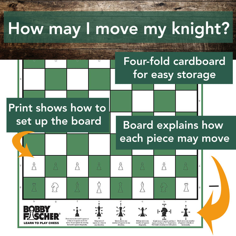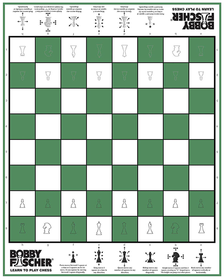 Whether you're introducing chess to your family or seeking to improve your skills, the Bobby Fischer Learn to Play Chess Set Board Game offers a complete and enjoyable experience. Award-Winning Design: Winner of the Mum's Choice Award, Best Homeschooling Curriculum and Resources Award, and a STEM.org Authenticated Educational Product, learn and master the game of chess. Illustrated Chess Board: The folding board (19.75 x 15.75 in. with 1.75 in. squares) features clear illustrations that guide you through the proper setup and allowed moves for each chess piece. Regulation Chess Pieces: The set includes 34 plastic Staunton chess pieces that meet USCF and FIDE requirements for tournament play. The king measures 3.75 in. tall, and 2 extra queens are included. Comprehensive Instruction Book: The "Learn to Play Chess" booklet provides detailed instructions, special chess moves like Castling and En Passant, tips from chess masters, and game history.
