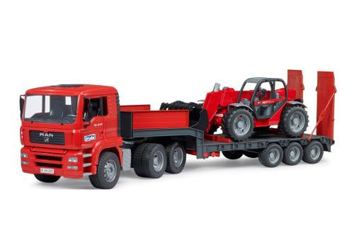 Low loader trailers are often used to perform heavy transport tasks, such as transporting large construction machines from construction site to construction site. In the BRUDER Construction theme world, the MAN TGA low loader transports a Manitou MT633 to its next deployment location. This impressive vehicle has the familiar features of the MAN low loader, such as the fully functional turntable coupling of the semitrailer, folding supports and movable access ramps. The supplied steerable telescopic handler has an extendable and height-adjustable telescopic arm as well as a detachable shovel.