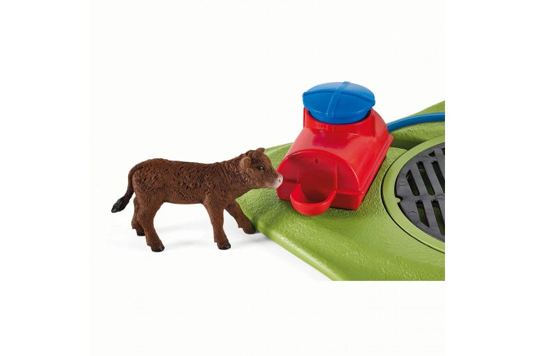 Contents: 1x farmer, 1x cow, 1x calf, 1x pitchfork, 1x hay, 5x pasture fence, 1x gate, 1x cow brush, 1x cow brush holder, 1x bar, 1x base plate with turntable, 1x hose, 1x water pump with spray function.