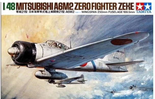 Featuring a lightweight design, a 940hp Sakae 12 engine, and armed with two 7.7mm machine guns and two 20mm cannons, the A6M2 (Model 21) Zero was nearly invincible as Japan's military advanced across the Pacific in the early years of WWII. This kit accurately reproduces the form of this legendary aircraft and features fine surface details as well as a thorough cockpit. Canopy may be assembled in open or closed positions while the landing gear may also be depicted in deployed or retracted positions. The kit comes with two pilot figures and five marking options, including one for the aircraft flown by Japanese ace Saburo Sakai.