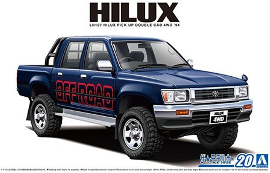 The Aoshima Hilux LN107 is a 1/24 scale plastic model kit that faithfully reproduces the 1994 Toyota Hilux Double Cab 4WD. There are two primary versions available for this pickup cab: the standard catalog specification and a modified "Lift Up" version